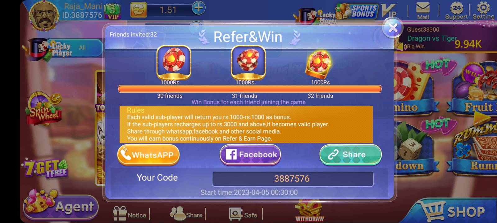 Yes, 3 Patti Room offers a referral system where you can invite friends and earn a percentage of their deposits or activity. You’ll receive bonuses and even unlock team rewards if you refer more users.